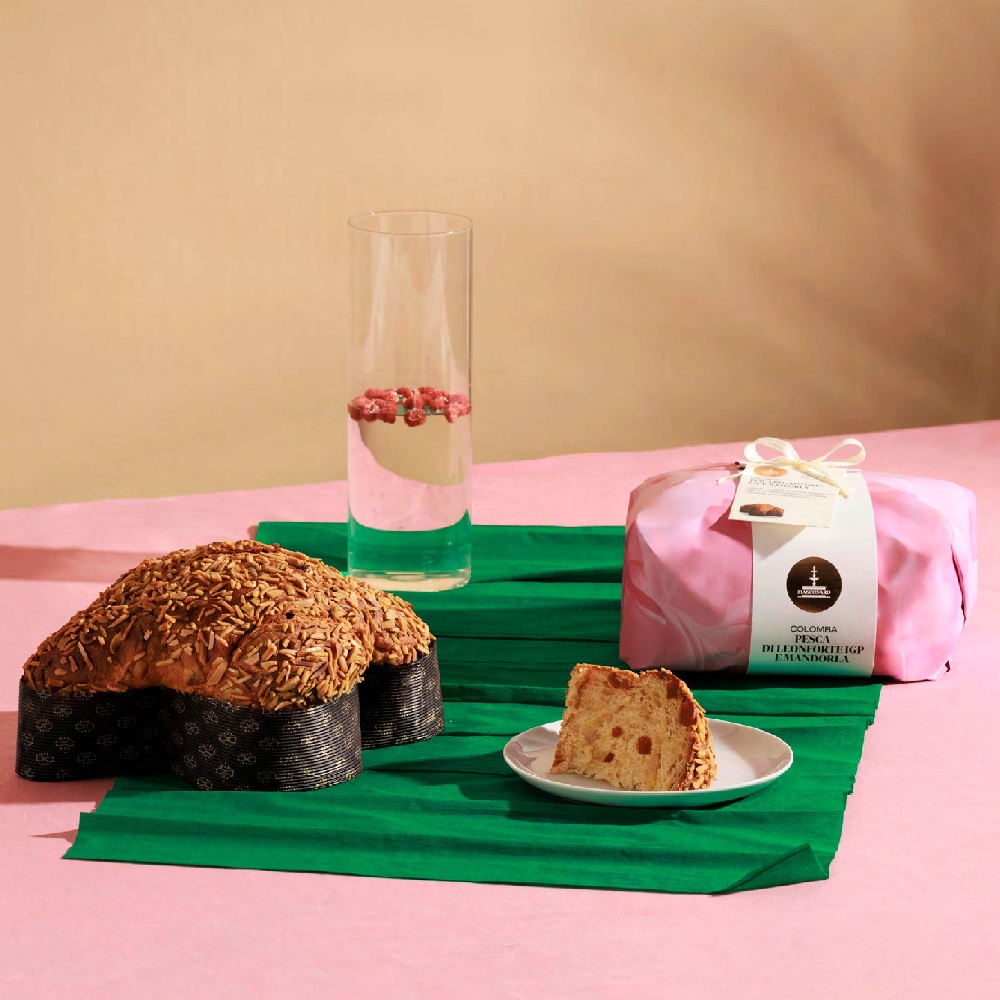 Пасхальный кекс коломба с персиковыми цукатами «Персик из Леонфорте IGP», с миндальной пастой и украшен палочками из миндаля. Упакован вручную.